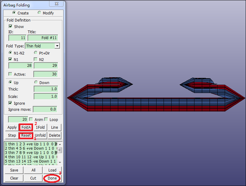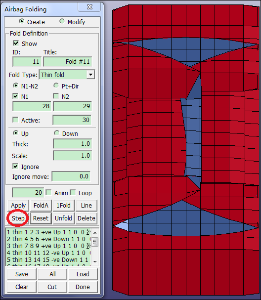 Contents Part V: Application Tutorials | Chapter 2: Introduction to Airbag Folding | Print page 2.5. Preview Folds, Accept, and Save ModelClick Step 10 times.Click Reset.Click Fold.Click Back render button.File > Save Keyword.Enter Filename: thinfolded.k.Click Save. « 2.4. Create Thin Fold Definitions #2-9 2.6. Open Original Model »