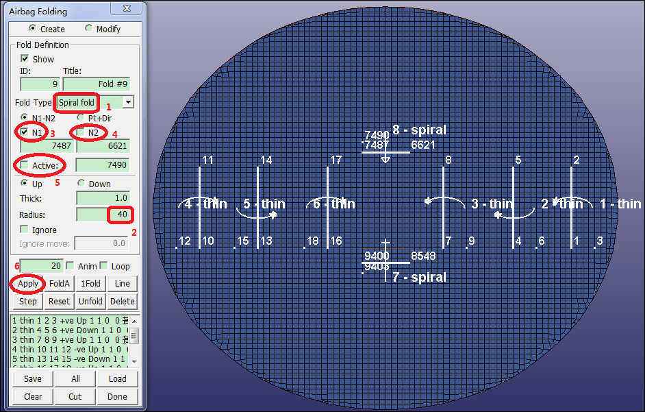 Contents Part V: Application Tutorials | Chapter 2: Introduction to Airbag Folding | Print page 2.12. Create Spiral Fold Definitions #7 and #8Select Fold Type: Spiral fold.N1 = 9400, N2 = 8548, Active = 9403, select Up.Enter Radius = 40.Click Apply.N1 = 7487, N2 = 6621, Active = 7490, select Up.Click Apply. « 2.11. Create Thin Fold Definition #1-6 2.13. Perform Folding and Save Model »