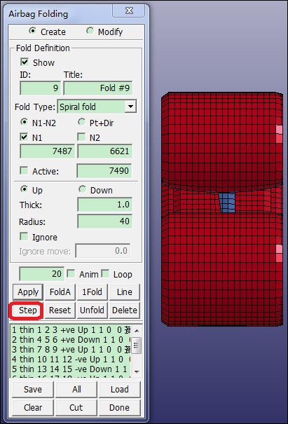 Contents Part V: Application Tutorials | Chapter 2: Introduction to Airbag Folding | Print page 2.13. Perform Folding and Save ModelClick Step 8 times.Click Clear All render button.Click Back render button.File > Save Keyword.Enter Filename: spiral.k.Click Save. « 2.12. Create Spiral Fold Definitions #7 and #8 Chapter 3: Introduction to Belt Fitting »