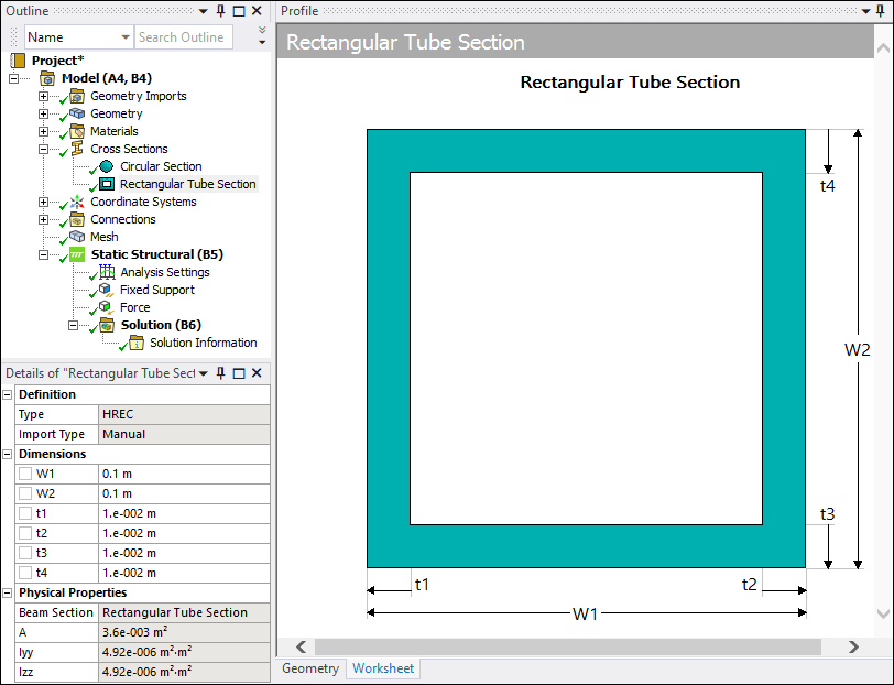 Note: DesignModeler uses a different cross section coordinate system than Mechanical (Mechanical APDL solver). Mechanical displays Izz whereas DesignModeler displays Ixx. In DesignModeler, the cross section lies in the XYPlane and the Z direction corresponds to the edge tangent. In the Mechanical environment, the cross section lies in the YZ plane and uses the X direction as the edge tangent. This difference in orientation has no bearing on the analysis.
