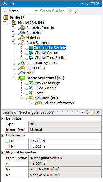 Important: The application cannot complete the solution process if one or more cross sections share the same name and will display an Error message when duplicate names are encountered. You can manually change the names (in your CAD application or in Mechanical) or use the context (right-click) menu option to have the application change the duplicate names. Also note that, if you are using Model-to-Model linking, Ansys recommends that you set the Workbench Project page Object Renaming property accordingly.