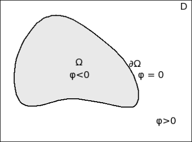 This method manages shape description through pure geometric information and defines a shape without ambiguity. That is, for the shape, defined over the working domain, using an auxiliary function, denoted as the level-set function, specifies positive, zero, or negative values, such that: