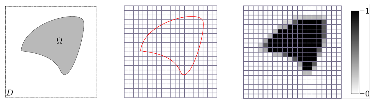As to the one layer of elements cut by the zero level-set, they receive an intermediate density in accordance with the solid fraction.