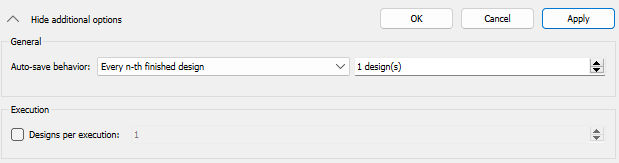 The project, including the database, is auto-saved (depending on defined interval) after calculating this node/system (either when the calculation succeeds or fails). By default, all parametric and algorithm systems have Every nth finished design 1 design(s) selected. All other nodes have No auto-save selected. |
