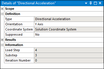 Load Step Substep Result Description 4 1 Displacement solution. 4 2 Velocity solution (if the Calculate Velocity property in Output Controls is set to ). 4 3 Acceleration solution (if the Calculate Acceleration property in Output Controls is set to ). Note: The value of the Iteration Number property varies based on analysis specifications. It is application defined, is information-based only, and has no impact on results.