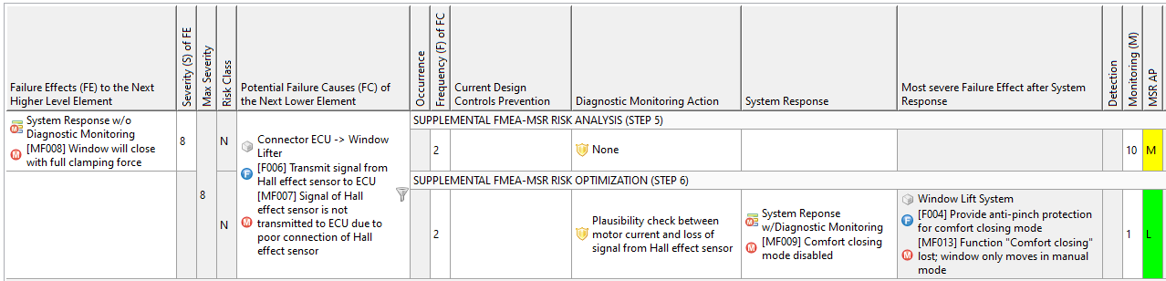 As one application of the hybrid failure net, the Monitoring and System Response (MSR) FMEA provides new columns for system response to model mitigated effects and automatically shows the most severe effect. In conjunction with this addition, the cornercase of M=1 for the Action Priority (AP) ranking has been changed. The severity of the mitigated system effect is then used in compliance with VDA-AIAG.
