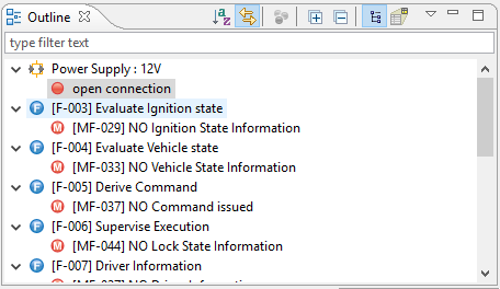 The Outline view shows additional context information for the currently active editor. Having a Failure or Function Net open, the view now not only shows all elements in the net but also their respective containers. That's especially helpful if there are many elements (e.g. failure modes) having the same name.