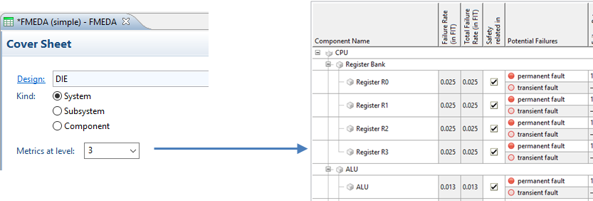 | New DC Worksheet options | SysML models can be structured by containment, which is a challenge for the flat structure of an FMEDA/SPF and LF metric analysis. For example, a BOM might be contained in a PCB model that defines the circuits in a hierarchical manner or a chip design could contain multiple levels of parts, sub-parts, sub-sub-parts, etc. The FMEDA/DC Worksheet provides a new option to select the corresponding level. In addition, we've added filtering of ports and transient failures from the SPF/LF metrics for a more convenient model/worksheet interaction.