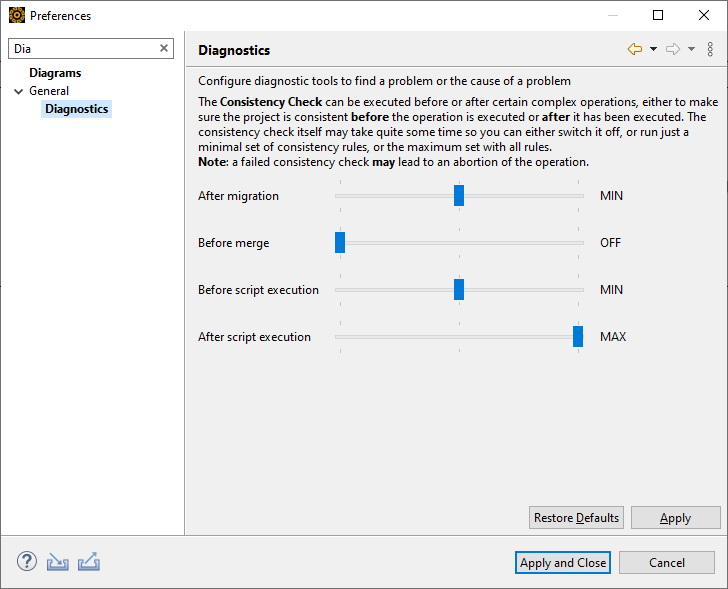 The consistency check (sanity check) is now configurable via preferences without any debug/dev mode necessary. The consistency check is a diagnostic feature of the tool to check whether project data integrity is given, e.g. after tool crash, script executions, and so on. You can adjust the level of checking at different triggering points (e.g., migration, merge, script execution).