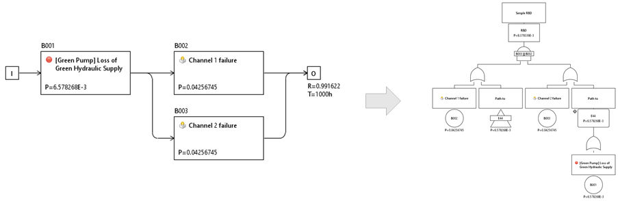 | Derivation of fault trees from RBDs | Sometimes it is useful to generate an equivalent fault tree from an RBD (or parts of it) to either use it directly in an FTA or adapt the fault logic in a way where fault trees come in more handy. For this purpose we provide you with a swiss knife feature to "Derive FTA..." from any RBD (or complex block): simply convert the block logic into a fault tree!
