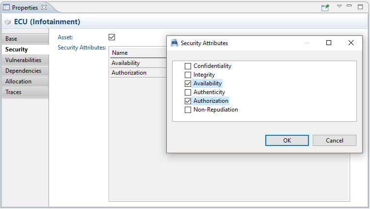 Any system model element in a system architecture can be marked as Asset, including the definition of its security attributes. The set of potential security attributes, like the well-known CIA triad "Confidentiality", "Integrity" and "Availability" can be customized in the project settings, for example to CIAAA or HEAVENS (HEAling Vulnerability to ENhance Software Security).