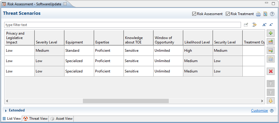 Identified Threats can be collected and maintained in Threat Collections. Their likelihood levels can be pre-estimated based on individual likelihood parameters, leading to a decision to further analyze and assess the potential risk of the threat. The Risk Assessment for threats is supported in TARA editors; pre-estimated likelihood parameters are overtaken, and the impact levels can be estimated. Out of likelihood and impact level an overall security / risk level is calculated based on the HEVANS risk graph. Based on the acceptance criteria of the corresponding stakeholders, mitigation measures can be defined and applied.