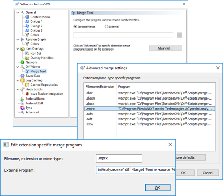 This feature fosters the integration of medini as compare and merge tool using arbitrary Revision Control Systems (RCS) as for example Subversion or Git, hat support a CLI based integration.