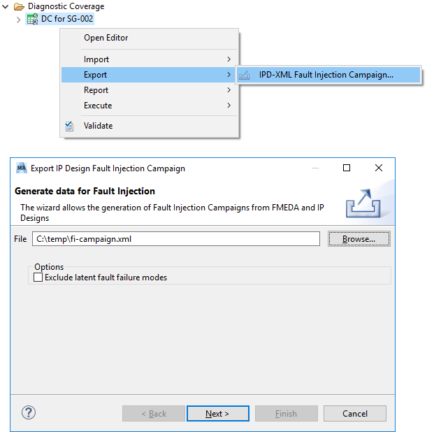 There is a new export option at DC / FMEDA worksheets to start an IPD-XML export to feed a fault injection run.