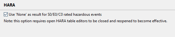 A new option for the HARA is available that enhances the risk graph of ISO 26262. When the option is enabled, any value of C0, E0, or S0 will lead to the new literal "None" for the ASIL. This can be useful to distinguish hazardous events with rare exposure, no injuries, or fully controllable situations from hazardous ones rated as QM.
