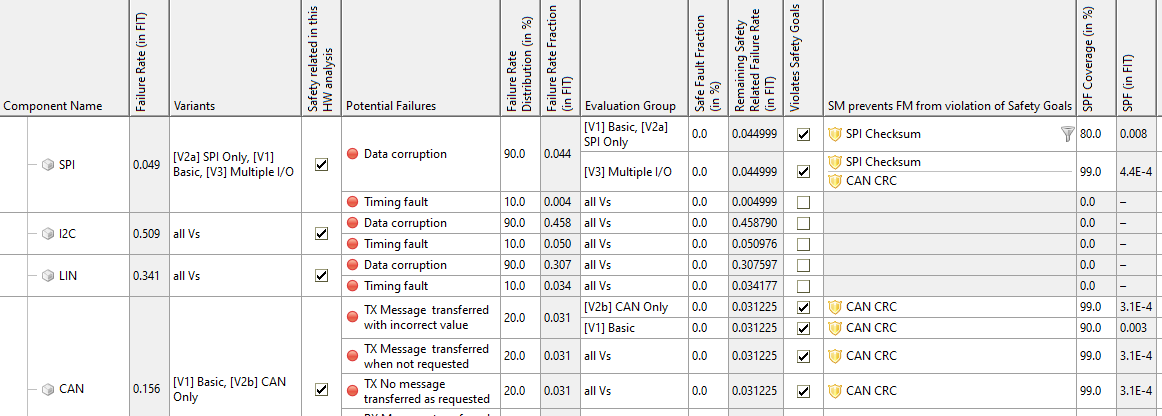 | Variability Support for FMEDA | The FMEDA now supports the analysis of multiple variants and configurations in a single worksheet. While you had to switch between multiple worksheets in previous releases, the new enhanced FMEDA worksheet provides a convenient way to treat system designs that include variation points, allowing you to determine effectively SPF/LF/SFF metrics per variant. For ISO 26262, this works also in conjunction with multiple safety goals.