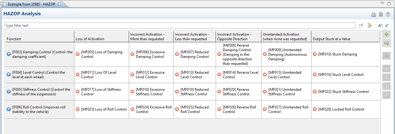 The following shows an example analysis with four functions of a suspension control system design (from SAE J2980). The functions have been added selectively to the table editor from a SysML model: