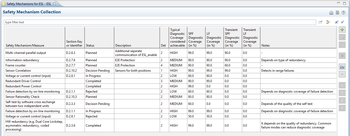 Safety mechanisms can be managed in measure/mechanism collections as described in Measures and Design Controls. These collections contain the actual safety mechanisms used in an FMEDA (Diagnostic Coverage analysis) or FMEA.