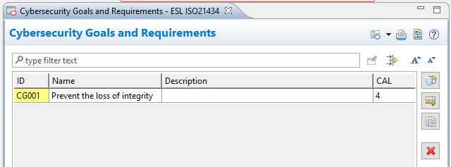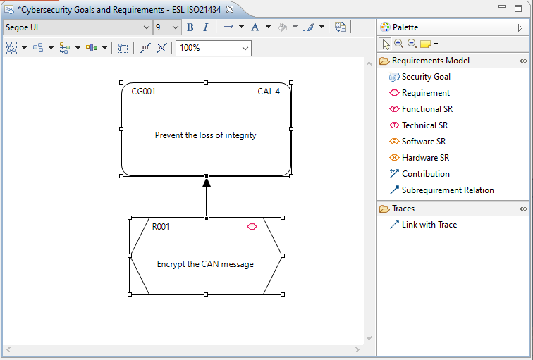 You can start the creation of security goals and requirements and their dependencies using the graphical editor by dragging requirement from the tool palette. The security goals have an Cybersecurity Assurance Level (CAL) associated that ranges from 1 to 4 and depends on the determined risk during the risk assessment.