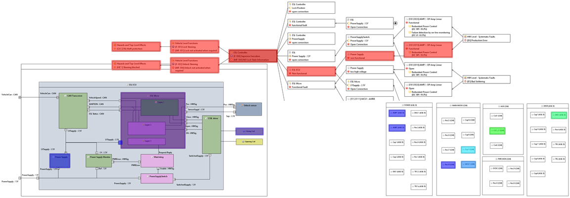 In addition to FTA diagrams, you'll have the same qualitative cut sets and heatmap visualizations in the Failure Net as well as SysML graphical editors. That means you can visually inspect the failures of components in the SysML design diagrams and their cause-effects along the FMEA hierarchy.
