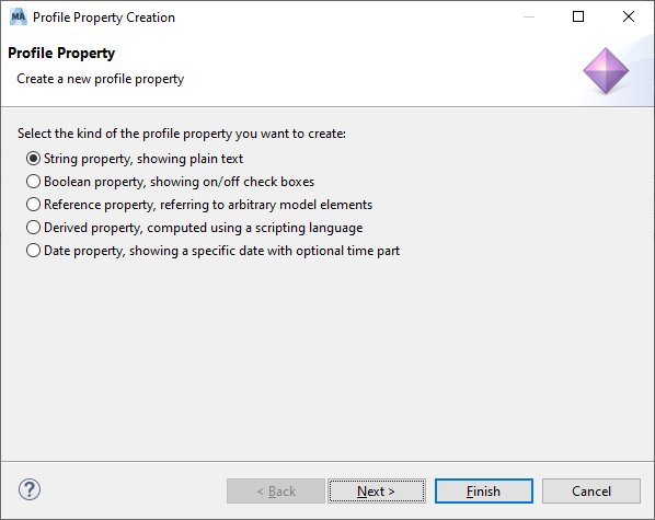 In the lower part of the dialog you are able to specify the properties which shall be added to the selected activated element. Clicking on "Add" will create a new entry in the table. The details of the new property are provided in a wizard dialog. On the first page of the dialog, you have to choose the kind of the property to be created. medini analyze supports: