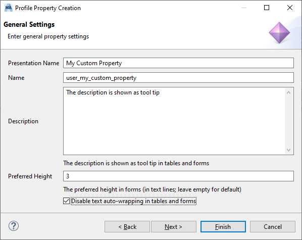 Once the "Finish" button in the wizard dialog is pressed, the new property for the selected element type is created. After finishing the add property wizard, the profile page of the settings dialog is active again.