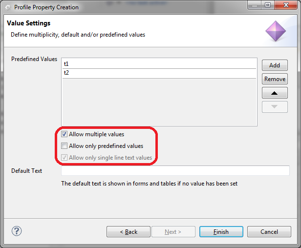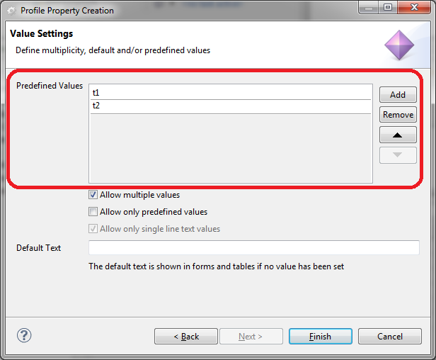 In the field "Default Text" it is possible to specify a text which is shown for the property after the element is created. This text can either be one of the predefined values or an arbitrary string. Please note with the multiple value option disabled the definition of such default values is only effective for elements that are created after the default value is specified. For existing elements, it is not applied. With the multiple value option enabled the default text is shown for all elements for which no value is selected.