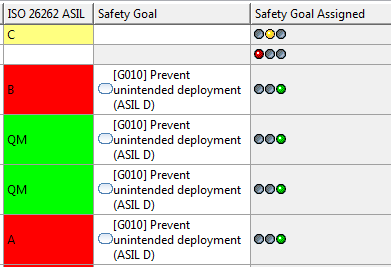 In the example, the property "Safety Goal Assignment" is created for elements of type "Hazardous Event". The variable "self " refers to an actual Hazardous Event in the model. The script evaluates the presence of a safety goal for an hazardous event and displays the evaluation result as a simple traffic light. It creates the following output in a hazard table: