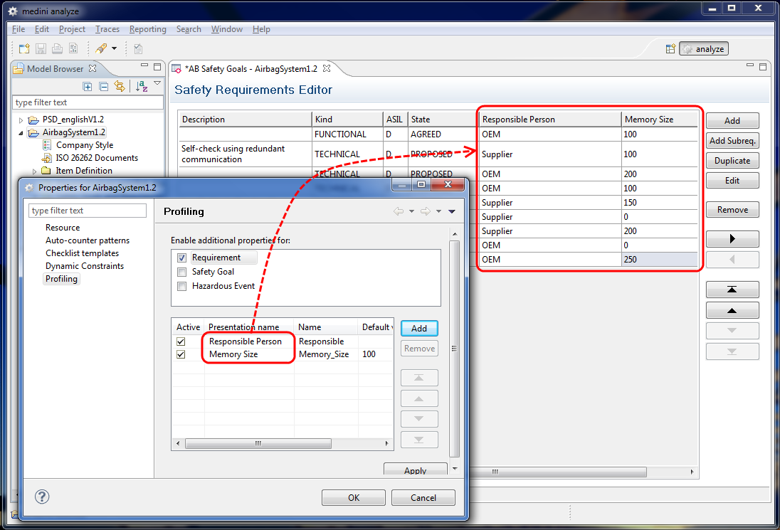 Depending on the element for which the profile properties have been defined, they may show up differently. If the element is presented in a table (e.g. Safety Goal or Hazardous Event) then for each user-defined property a new column will be added to the table-view of the profiled elements. An example is shown in the next figure.