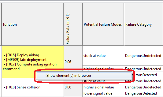 The following shows an example for the usage of a reference type property in a table view. As to be seen, the property holds multiple references to elements of type "Function" including the subtype "Malfunction". By double clicking the cell in the table editor, a dialog window opens, which allows to select as well as to de-select the referred elements.