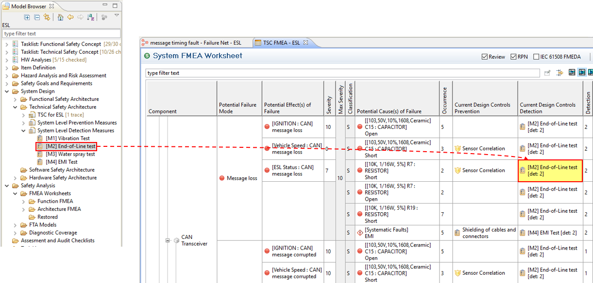 Safety mechanisms can be managed in measure/mechanism collections as described in Measures and Design Controls. These collections contain the actual safety mechanisms used in an FMEDA (Diagnostic Coverage analysis) or FMEA.