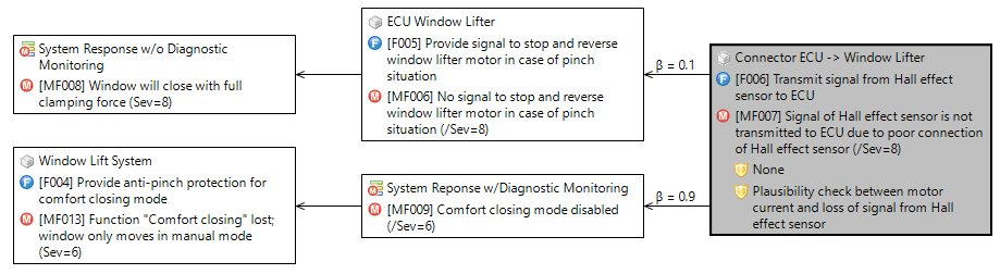 The VDA-AIAG guideline for FMEA introduces the concept of a hybrid failure net that distinguishes between primary effects without (or insufficient) diagnostics and mitigated effects as system response. This distinction is now available and can be modelled in the cause-effect chain.