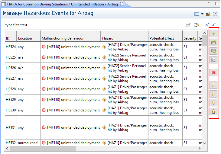Below the Automotive HARA editor is shown. All manual editing functionality is located at the right side of the table, i.e. Add, Add before/after, duplicate, delete, and move up/down:
