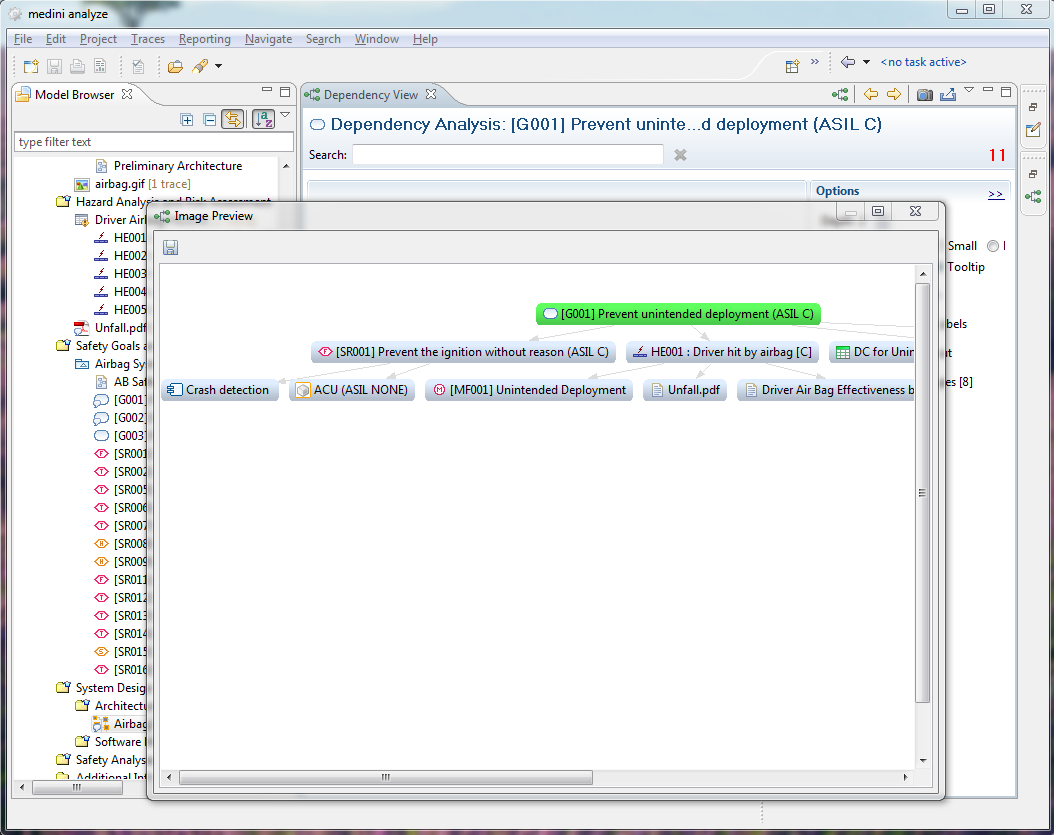 The dependency viewer offers a possibility to visualize relations between model elements. The dependencies are computed following the relations from one specific element (the focus). Relations that are taken into account are those that are also available in the relations submenu of the context menu (see Element Relationships).