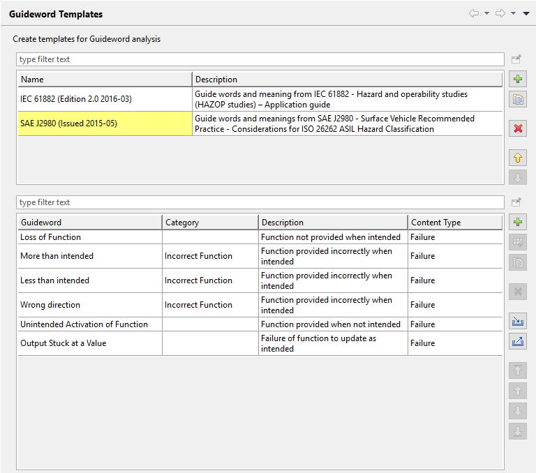 A Guideword Template defines the guidewords used in a subsequent Analysis, e.g. a HAZOP. Each project can maintain a set of Guideword Templates for different application cases, e.g. to identify failures, limitations, or even vulnerabilities for a cybersecurity project.