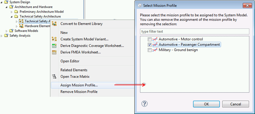 SysML model: If assigned to a model, all elements inside will use the same mission profile, unless an element redefines a mission profile. See below for the special case of block types.