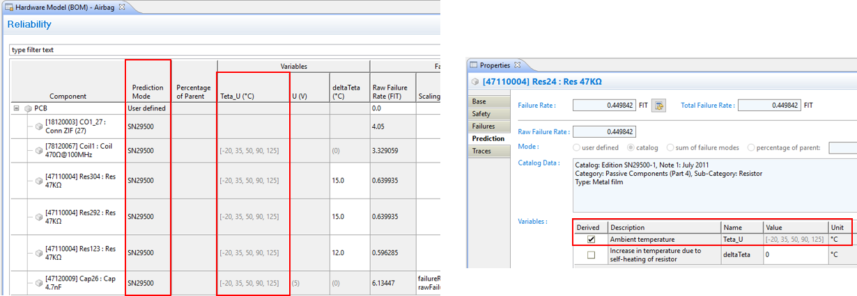 A variable may be marked as derived - in that case its value is not specified at the element itself but is taken from the container element (recursive lookup) or from the current instance context for types and their contents (see details below). The usage of derived variables is a convenient way to adapt the failure rates of a complete subsystem or Printed Circuit Board consisting of a number of components in one step: just change the variable value for the parent element (e.g. operating temperature) and select "Recompute Failure Rates" button to update the failure rates.