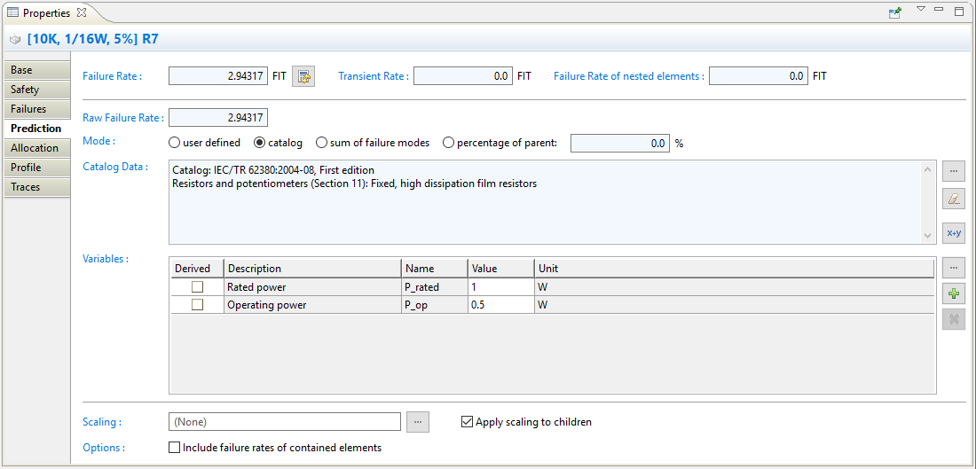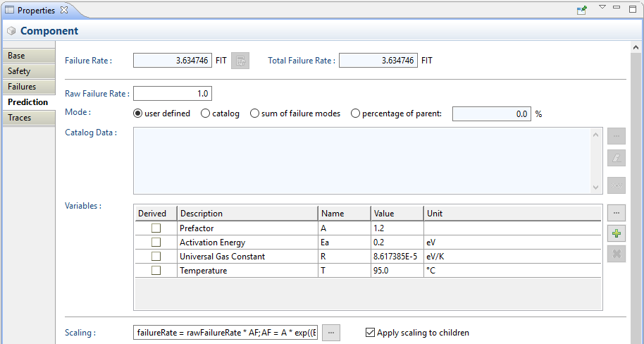 Raw Failure Rate: The failure rate of the component without scaling. If the selected mode is "user defined", the value can be directly entered into the field. For the options "catalog" and "sum of failure modes" it shows the raw value without any scaling applied (see below).