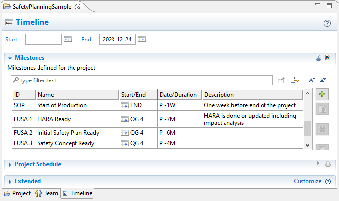 Milestones can be used in safety planning as anchors for safety activities. In addition, you can set milestones to plan when the safety artifacts required by specific safety analysis activities become available.