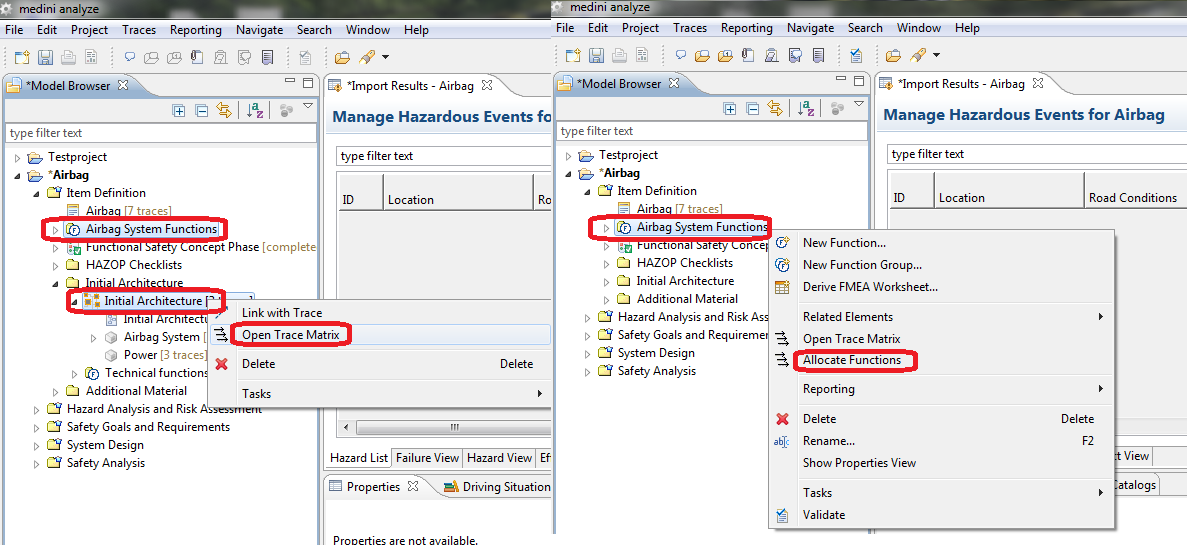 In addition, for selected activities a direct access to a trace matrix is also available by the "Allocate xxx" command from the context menus of packages in the Model Browser or from the main menu "Traces".