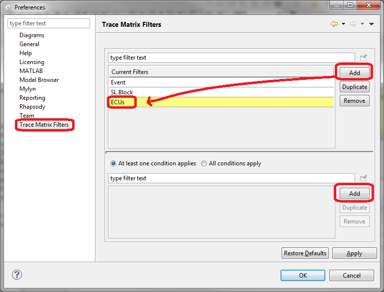 In order to use a predefined filter in the trace matrix configuration it has to be defined beforehand according to your needs. The filter definition wizard can be opened by either clicking on the "Open Filter preferences" link in the Trace matrix configuration or by opening the medini analyze preferences window (Window->Preferences) and selecting "Trace Matrix Filters".