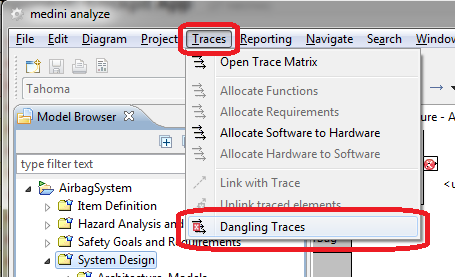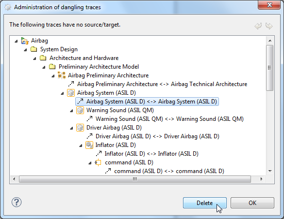 Dangling traces are traces for which at least one of the elements that are connected does not exist any more while the trace itself is still part of the model. A potential source of a dangling trace is the teamwork, i.e. when two models are changed in parallel. The tool does not automatically delete these dangling traces, as you might want to see them to base decisions on this knowledge.