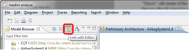 Note, that with enabling the "Link with Editor" button in the Model Browser, the corresponding editor (if one is open) will be activated and the element is highlighted in the editor.