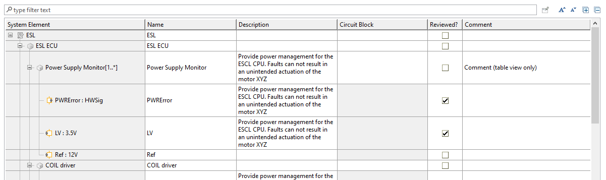 新しい「SysML表エディタ」は、モデル要素と同期された表形式のビュー表示を可能にします。表ビューの構成に基づいて、要素のプロパティの編集、プロファイルプロパティの編集、ビュー固有のプロパティの追加(表の上でのみ利用可能)がサポートされています。表エディタは、様々な要素のプロパティの表示と編集をサポートし、プロファイルプロパティによってビュー固有の列を追加することができます。