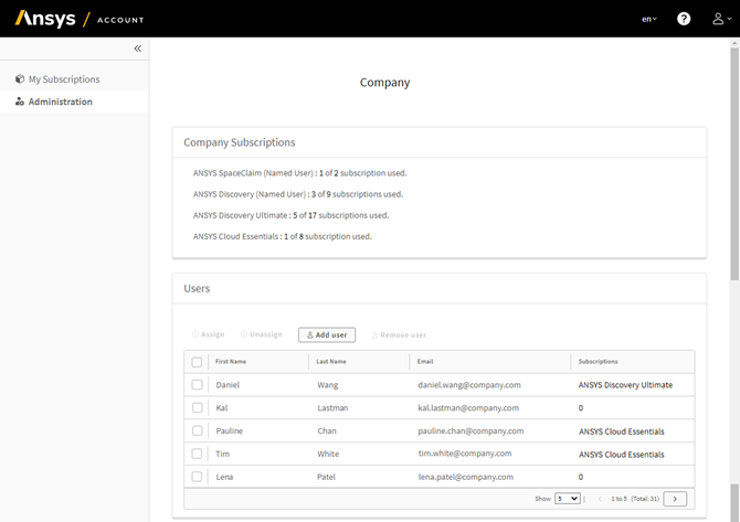 If your Ansys Account has administrator privileges, you can see a list of the subscriptions that your company has purchased by signing in to the Ansys Account portal at https://myaccount.ansys.com, and selecting the Administration page. This page also shows a list of added Users: