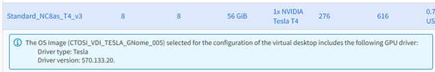 Note:If a custom OS image was selected for the configuration of the virtual desktop, and the OS image contains a GRID or Tesla GPU driver, only VM sizes that are compatible with that driver type (and VM sizes with no GPUs) are available for selection in the hardware list. If you then select a VM size with GPUs, the GPU driver options are not displayed, as selection of a GPU driver type is not required in this case. Instead, a message is displayed indicating the driver type that will be installed. For example:
