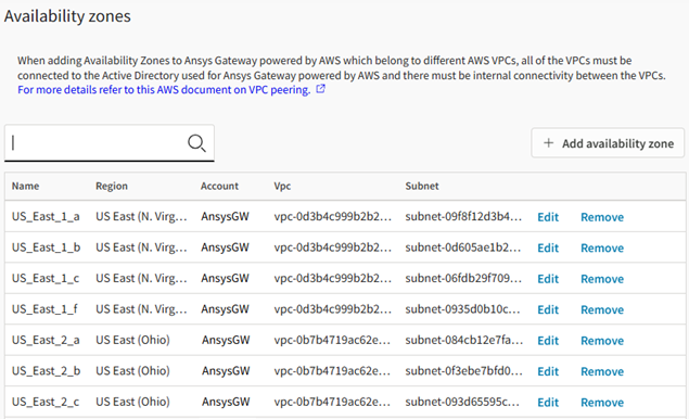 When creating project spaces and resources, the availability zones available for provisioning computing and networking resources are determined by the availability zones defined in the Ansys Gateway powered by AWS configuration.