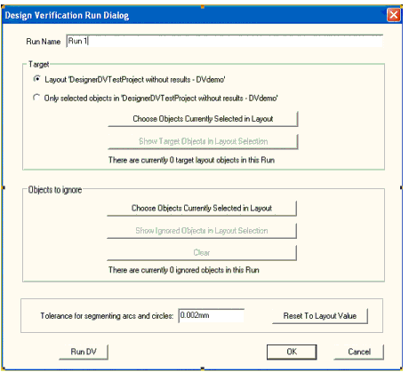 Click OK to save your changes and close the window. Click Run DV to run the design verification. Alternately, you can run the design verification by opening the Project Tree and clicking the Run Name that resides beneath the corresponding Rule Set.