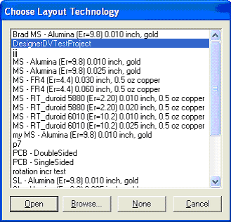 To re-use a saved technology file when creating a new design, select the technology file when prompted for a file to open. The new design are created with the same rule sets, runs, and scripts as the design used to create the saved technology file. If any of the saved-technology runs used selected or ignored objects, the same configuration are used to set up the new run, but the object count are reset to 0 because the new layout is empty.