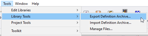Click Tools>Edit Library Tools to view tools for importing or exporting definition archives for UserLib and Syslib and to manage files relevant for various solver libraries.